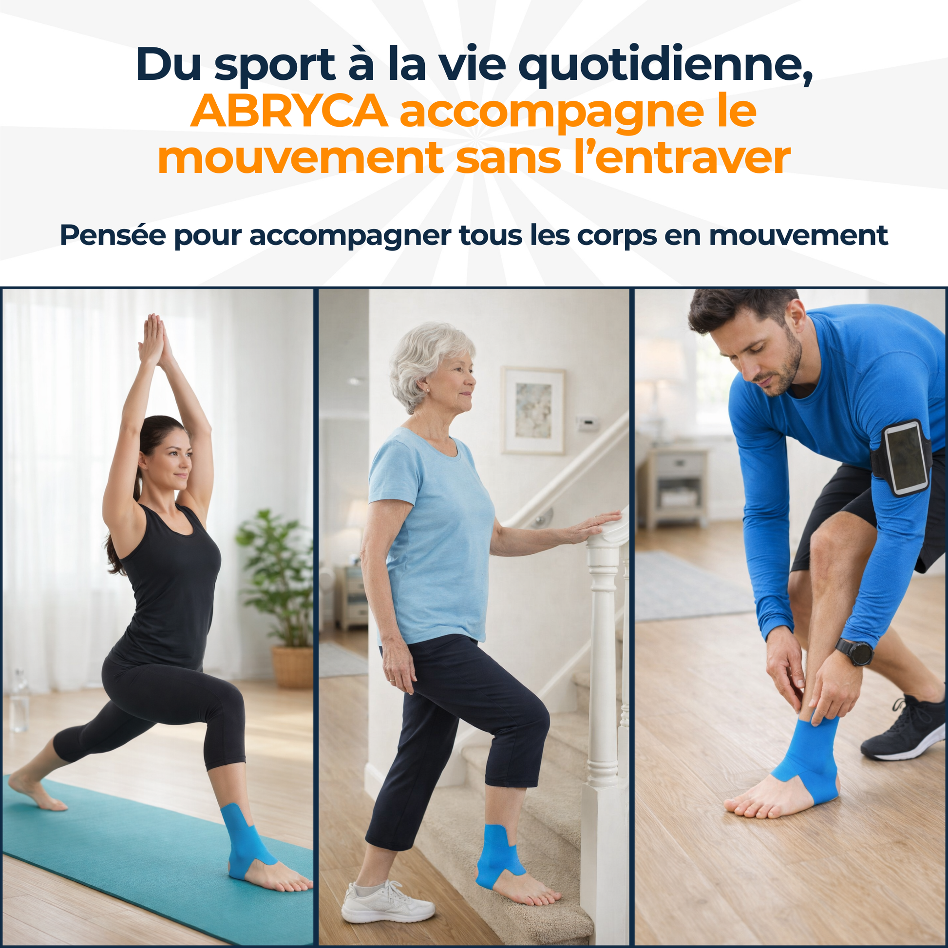Les bandes ABRYCA sont conçues pour accompagner le mouvement, améliorer la stabilité et réduire les sensations de gêne au niveau des articulations.