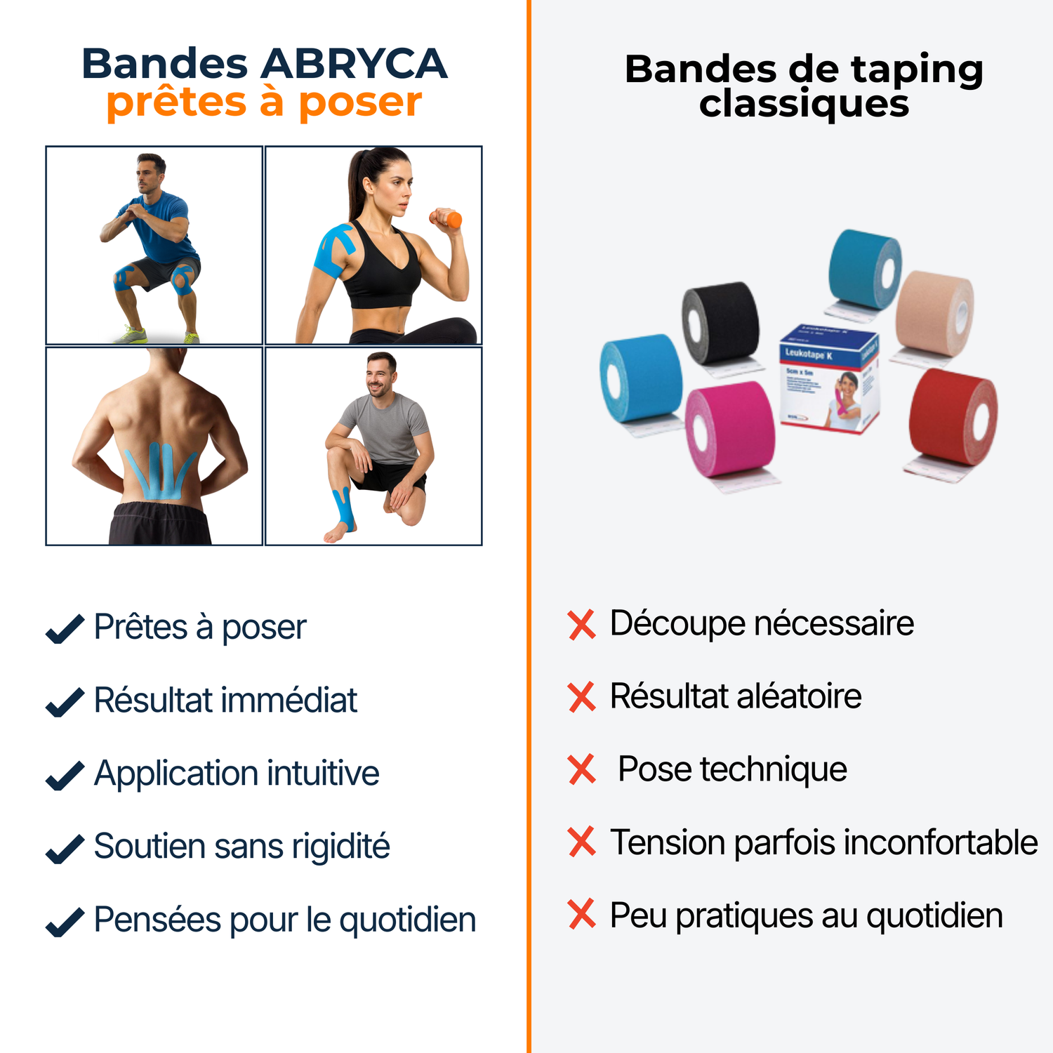 Les bandes ABRYCA sont conçues pour accompagner le mouvement, améliorer la stabilité et réduire les sensations de gêne au niveau des articulations.